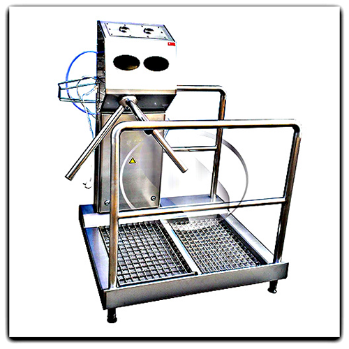 Универсальный санпропускник для рук и обуви премиум класса, имеет специальную ванну для дезинфекции подошв обуви, плюс турникет, который открывается, только после того как пройдет полный цикл дезинфекции персонала на производстве. Дезинфекция рук происходит автоматически, после того как руки разместить в специальном модуле для обработки рук.